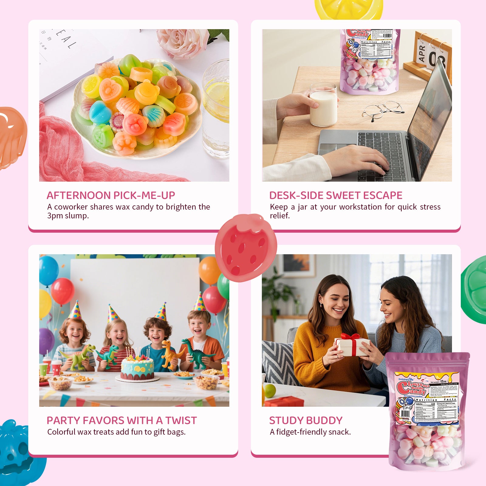 Discover an innovative twist on classic sweets with our wax-coated syrup candies. Each piece delivers a delightful duality, chewable wax shells that burst open to reveal luscious fruit syrups, creating a playful texture adventure in every bite.